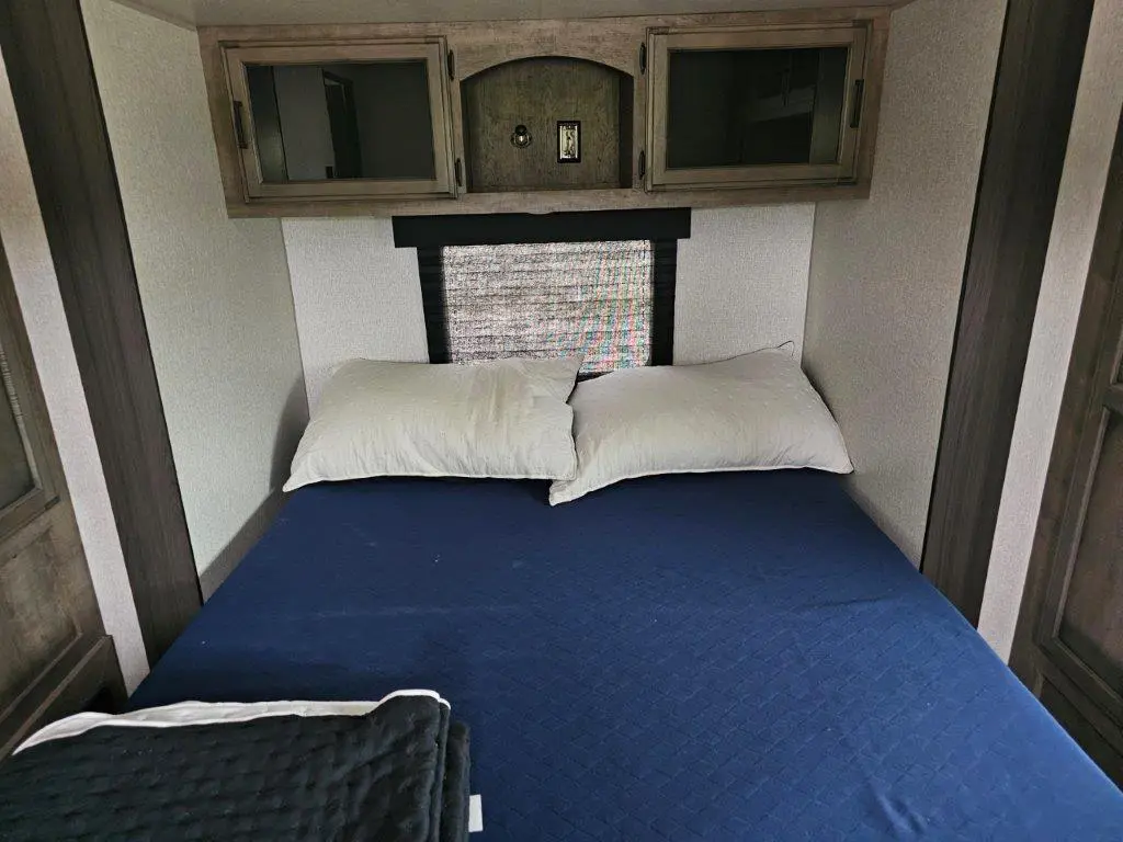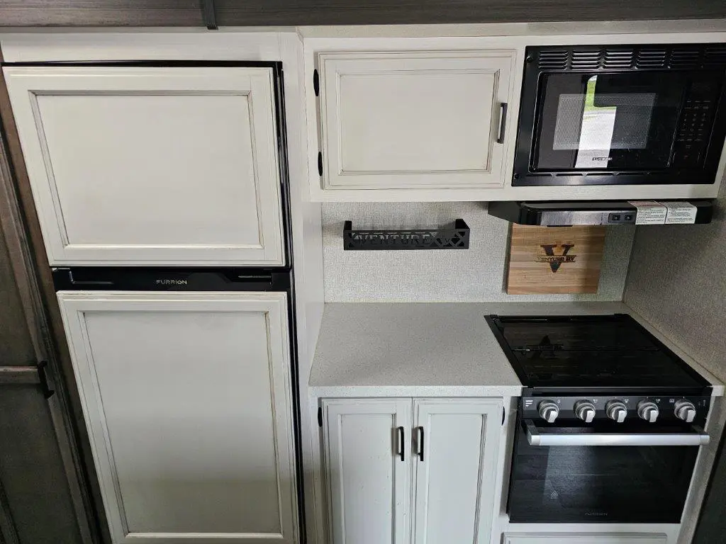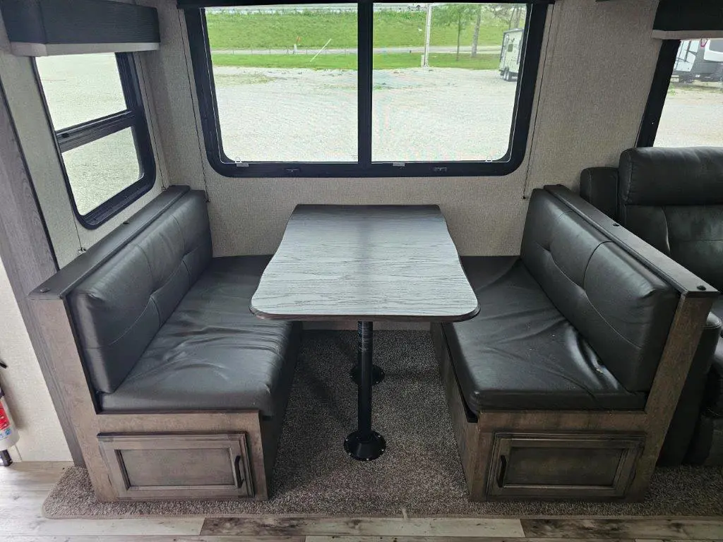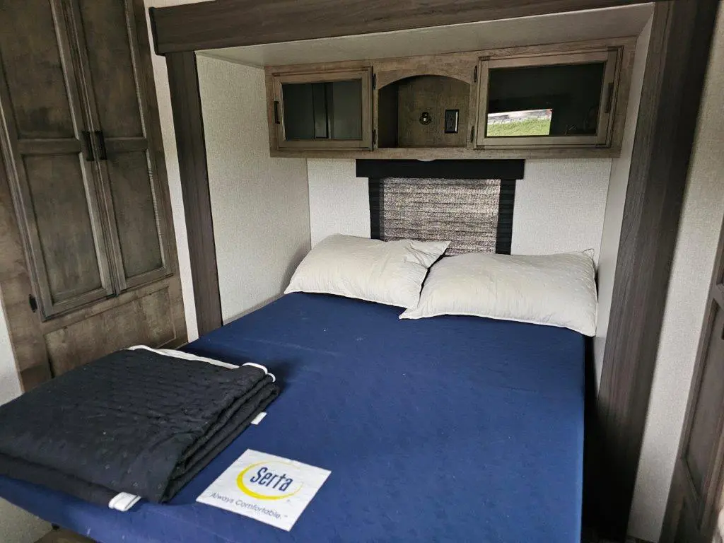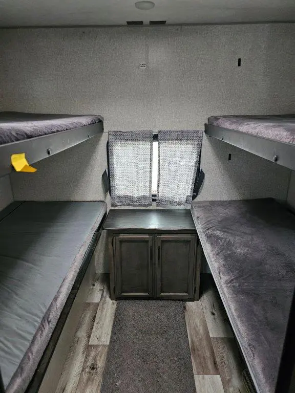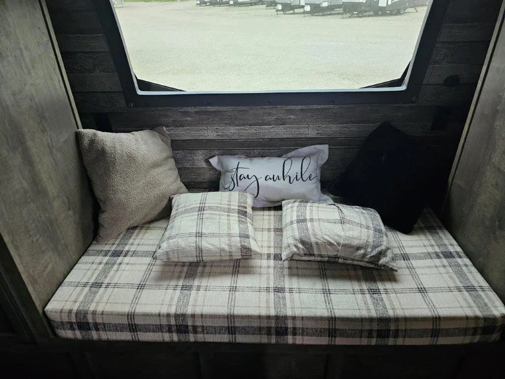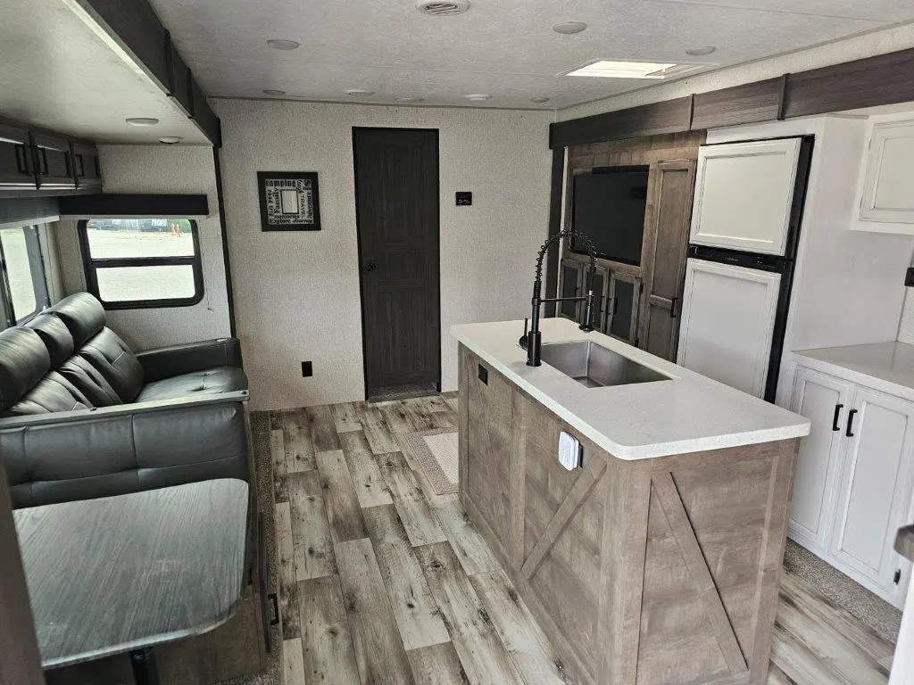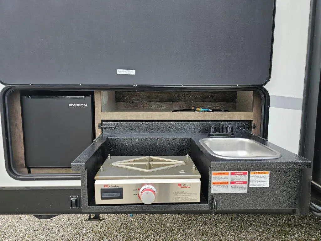 This travel trailer was awarded “2022 Bunkhouse Travel Trailer of the Year” for good reason! The rear private bunkhouse has a set of 32″ x 70″ bunk beds and a set of 28″ x 70″ flip up bunk beds, but what is really special about this room is its ability to convert to a desk, king bed, storage, and pet palace. The chef will enjoy having their choice of either cooking indoors with the kitchen island and three burner cooktop or cooking at the exterior campfire café with a refrigerator, a griddle, and a sink with countertop space.