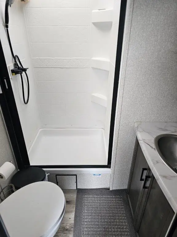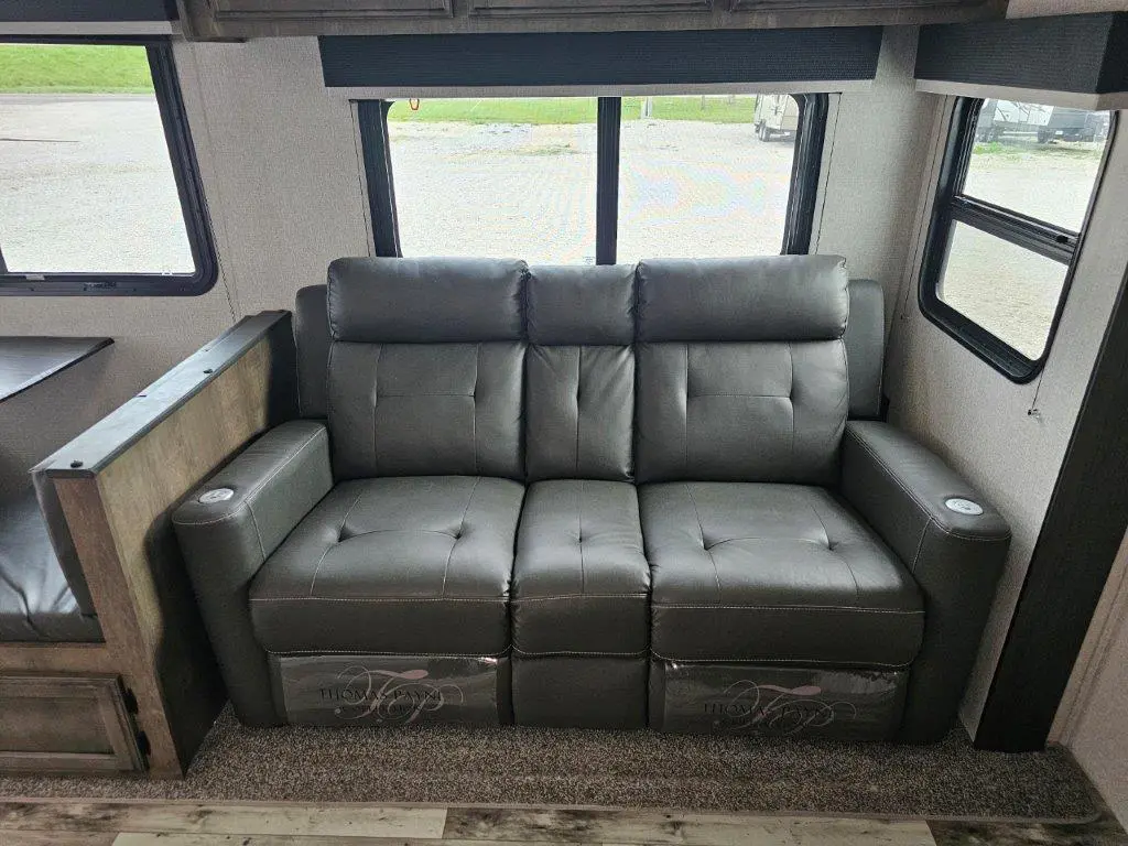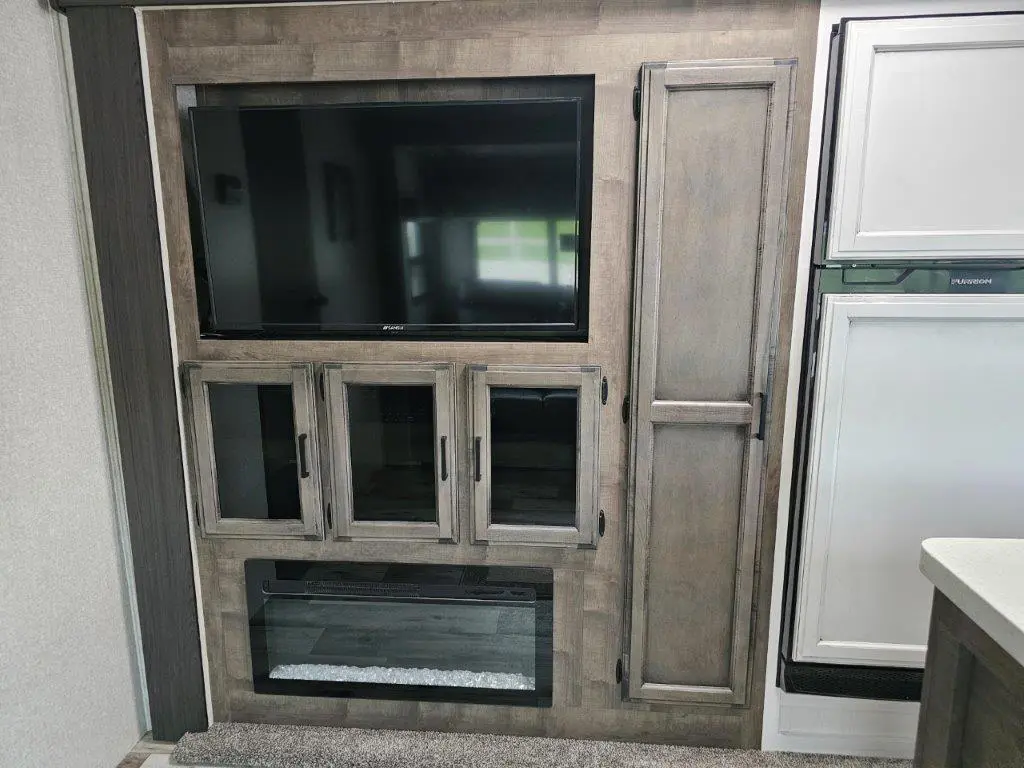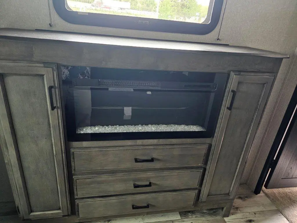 Relax each night in true comfort with a 70″ tri-fold sofa across from the entertainment center with a 30″ frameless fireplace, plus the front private bedroom has a 30″ frameless fireplace across from a 60″ x 80″ queen bed slide. The bedroom also has a window seat so you can look out at your beautiful scenery while reading a book and an interior wall wardrobe that is prepped to add an optional washer and dryer instead if you choose!
