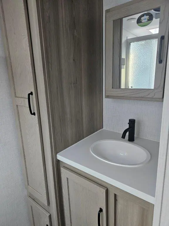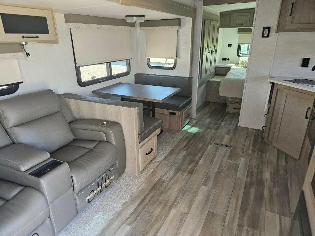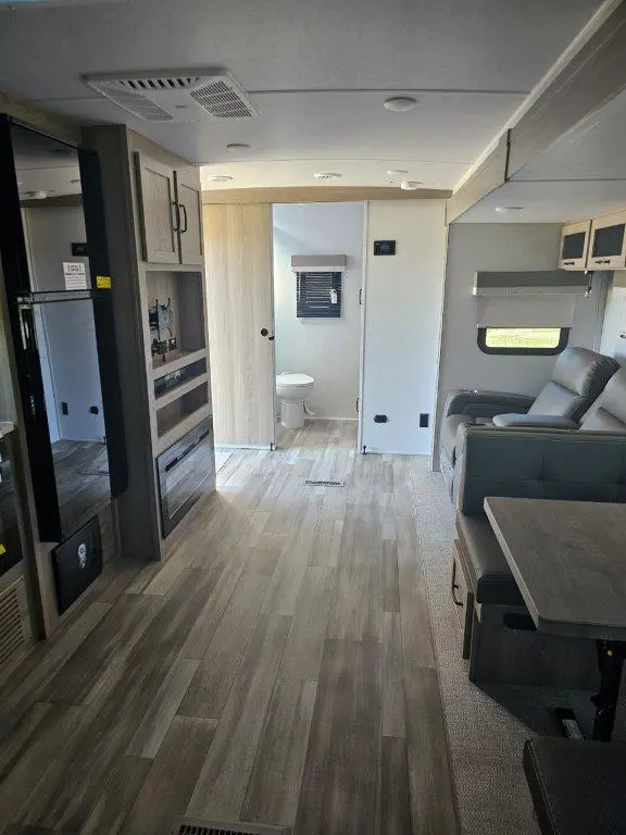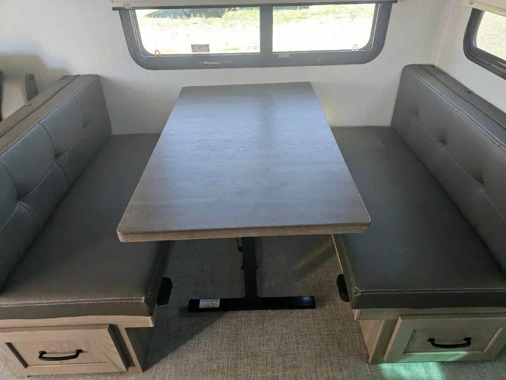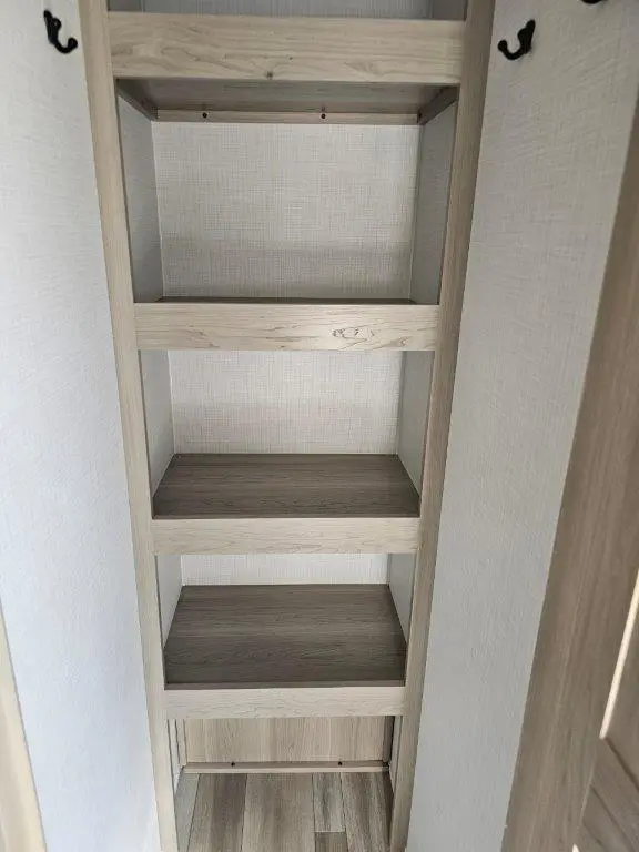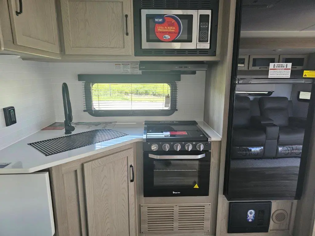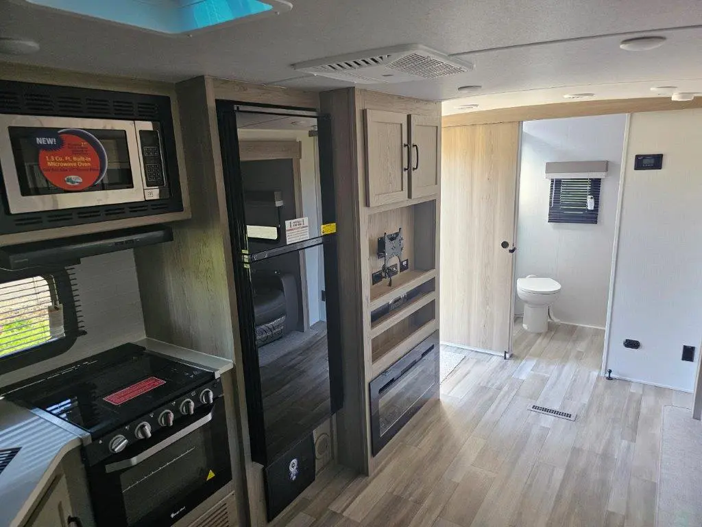 Enjoy inside comforts, and outside conveniences in this trailer. You can relax under the 21′ awning which offers an outdoor living area protected from the elements, and a pass-thru storage with a steel sliding trayallowing you to take camping chairs, tables, fishing poles and such. You’ll find ample storage space inside as well, including a walk-in pantry by the entry door for convenience! The cook will have full amenities to make meals, and when you are ready to sleep, head to the front bedroom with a queen bed and plenty of storage, and a large slide out giving you more floor and storage space.